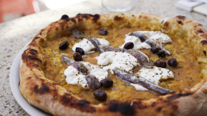 - A pizza with meaty Lampedusa anchovies on a yellow tomato base, with stracciatella, Riviera olives and oregano.