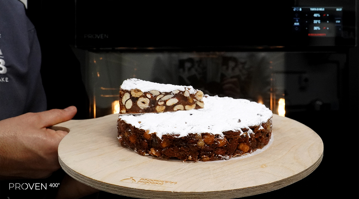 Dic222022RICETTEDolce tipico senese, consumato soprattutto nel periodo festivo, il panforte deriverebbe dal panmelato, preparato a Siena e dintorni già nell’anno Mille. Quella arrivata fino a noi è la ricetta del panforte dedicata alla regina Margherita di Savoia, con un ripieno di mandorle, frutta candita e spezie miste. In questa preparazione così particolare, la cottura statica di Proven®, delicata ed uniforme, è essenziale per cuocere alla perfezione il panforte, mantenendone la giusta consistenza in ogni punto. Otterremo così un panforte dai profumi e dal sapore inebrianti. Scopriamo come fare il panforte di Siena: Panforte ingredienti per 2 tortiere Ø 20 cm h 4 cm Sciroppo Zucchero semolato 240 g Miele di acacia 240 g Acqua 48 g Farcitura Farina W300 185 g Sale 4 g Spezia panforte* 16 g Mandorle sgusciate con pelle 460 g Nocciole tostate 200 g Arancia candita a cubetti 435 g Cedro candito a cubetti 300 g Fogli di ostia alimentare q.b. Zucchero a velo q.b. * in mancanza miscelare 12 g di cannella, 6 di coriandolo, 4 di macis, 4 di noce moscata, 4 di zenzero, 4 di chiodi di garofano, 4 di pimiento, quindi pesare il necessario. Calore – Proven® 195 °C, 50% cielo, 50% platea – Livello 0 – piano in superficie bugnata Panforte fatto in casa Procedimento Impostare Proven® per la cottura secondo i settaggi indicati, predisponendo il piano in superficie bugnata. Attendere che il forno arrivi in temperatura e iniziare tostando le mandorle distribuendole sulla teglia alluminata in dotazione rivestita di carta forno. Tostare per circa 8-9 minuti. Foderare con carta forno le tortiere su tutti i lati, quindi posizionare i fogli di ostia sul fondo. Porre in una casseruola gli ingredienti per lo sciroppo e cuocere fino a 121 °C. Mentre lo sciroppo cuoce, miscelare farina, sale e spezie, unendovi la frutta secca. Trasferire in planetaria e montare la foglia. Quando lo sciroppo sarà caldo, indossare i guanti da cucina, azionare la planetaria al minimo e colare lo sciroppo bollente sulla farcitura. Fermare la macchina dopo 10 secondi. Completare l’amalgama della farcitura a mano, aiutandosi con una spatola. Trasferire il composto ottenuto nelle due teglie. Munirsi di guanti monouso, inumidire quindi le mani e pressare la farcitura nella teglia per livellarla e far uscire eventuali bolle d’aria. Infornare e avviare il programma di cottura. Il panforte sarà pronto dopo circa 40 minuti, quando apparirà leggermente gonfio, dal colore uniforme su tutta la superficie. A questo punto inserire la sonda al cuore e sfornare a 96-98 °C. Una volta che il panforte risulterà tiepido, sformare con attenzione, eventualmente staccandolo dalla teglia con l’aiuto di un piccolo coltello liscio. Far raffreddare e cospargere generosamente di zucchero a velo. Come conservare il panforte fatto in casa Confezionato e conservato al riparo dalla luce, il panforte si conserva fino a 4 mesi. Leggi ancheBomboloncini al forno con cioccolato e lamponi7 Luglio 2025Colomba tradizionale18 Aprile 2025Bagels6 Settembre 2024Éclair Mojito10 Agosto 2024Pizza Peach Summer5 Luglio 2024Pane al cioccolato con lievito madre14 Giugno 2024